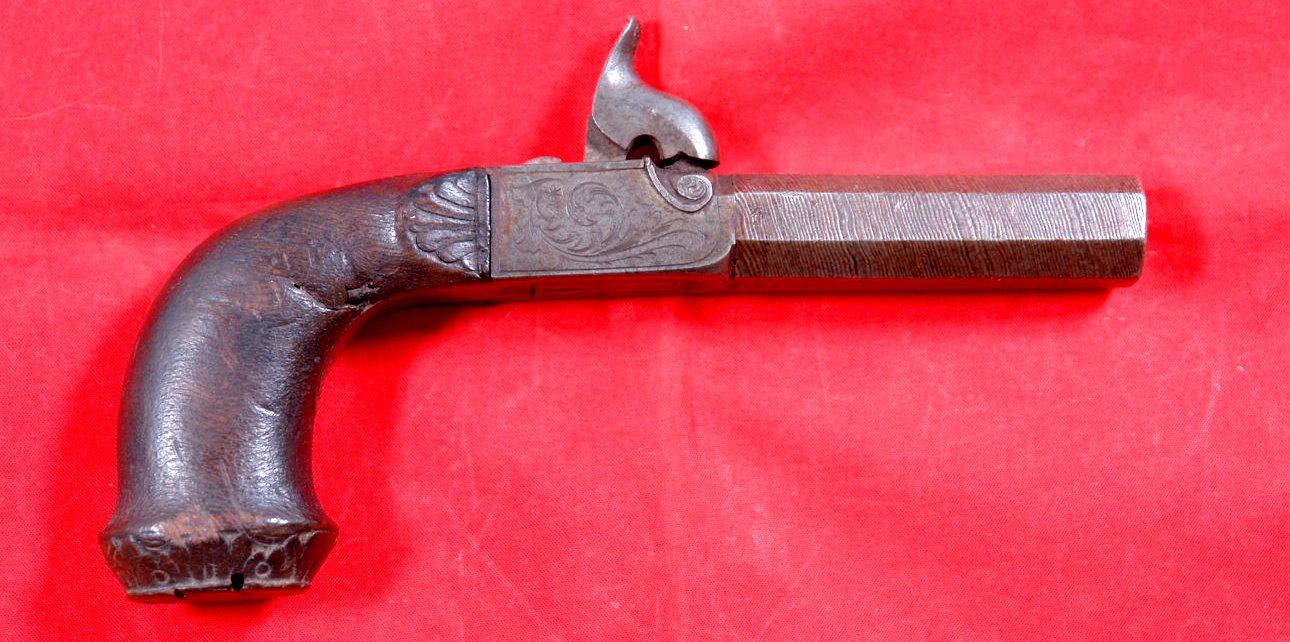 20428- FRENCH PERCUSSION .45 CAL. DAMASCUS BOX LOCK RETRACTING FOLDING TRIGGER POCKET PISTOL CIRCA 1840’S. 7” o/a with 2 ½” very finely figured Damascus smoothbore barrel. Floral. engraved box lock frame. Walnut grip with flattened floral carved butt and floral leaf carved frame panels. Very nice original finish with mixed dark handling patina on metal. Wood with the orig. finish. Perfect working order with trigger automatically retracting as it should. Nipple with wear otherwise excellent. Nice quality. $350.