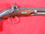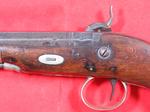 32678-BRITISH W. HOWELL, LONDON SILVER MOUNTED DERINGER STYLE PERCUSSION BELT PISTOL CA. 1840’S-50’S. 10” o/a with 6” octagon Damascus .50 caliber barrel engraved on top flat “LONDON” and with front and rear sights and double silver bands at breech. Lock floral scroll engraved and the with maker name. Checkered walnut stock with floral engraved German silver mounts and percussion cap trap in butt. German silver stirrup ramrod mount with original steel ramrod. Very good plus overall and all original in working order. Nice example of the form of pistol invented by Henry Deringer of Philadelphia by a well known London maker for the American market. Gold Rush, Mexican War and Civil War era. Nice looking authentic example at a reasonable price. $750.