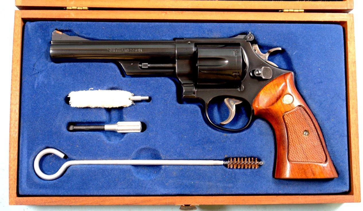 32960- 1978 SMITH AND WESSON S&W MOD. 57 6” BLUE REVOLVER REV .41 MAG IN ORIGINAL CASE. In good condition with 6” barrel and nice blueing all around. Slight signs of use but locks up tightly and feels good in the hand with the large grips. Comes in original wood presentation case with cleaning materials. $1600
