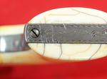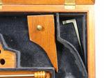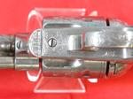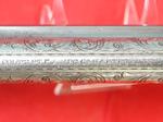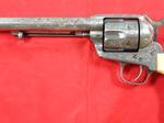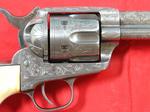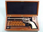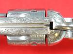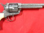 33081-EARLY CASED ENGRAVED COLT 1873 SINGLE ACTION ARMY .45 CALIBER REVOLVER MFG. 1877. 7 ½” barrel with early Colt Hartford one line block address. Frame with three patent dates and all matching serial numbers (40638). Nickel plated overall with the original ivory grips. Very similar style engraving illustrated in Wilson’s COLT ENGRAVING BOOK VOL.1, page 410 and 411 on Single Actions serial numbers 53078 and 92504 by factory engraver Cuno Helfricht. All original and in fine condition with much original nickel finish (50-60%). Perfect working order and excellent bore. Beautiful original ivory grips in excellent condition. Colt Archives records state it was shipped to Simmons Hardware in St. Louis in 1877. Letter does not mention engraving. With circa early 1900’s velvet lined walnut case. Extra nice and completely original in every respect. $12,500.