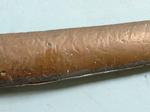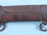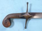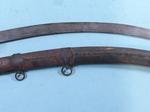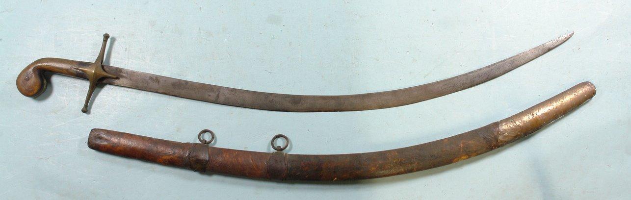 32943-TURKISH SHAMSHIR W/ SCABBARD CIRCA 1800. 37”o/a with 31” blade.Brass hilt and guard with horn grip panels. Blade with maker’s cartouche on right side. Nice old dark patina overall. Leather covered wood scabbard with brass mounts. $850.