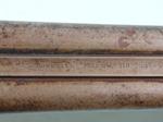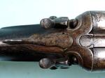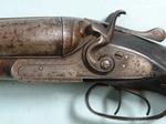 32750-BRITISH BONEHILL 10 GA. 32” SIDE X SIDE HAMMER DAMASCUS SHOTGUN. 2 ¾” Full & Full. London address on barrels. Locks engraved “THE BONEHILL/FIELD”. Good all original with wear and old dark patina. Locks in working order. Barrel release lever spring missing. Bores pitted. Wood with wear. Original butt plate. $200
