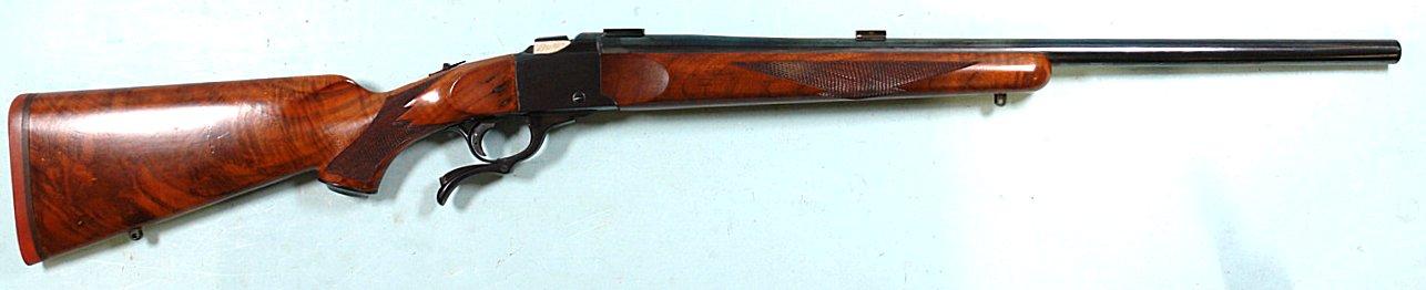 33004- RUGER NO. 1 SINGLE SHOT .25-06 CAL. RIFLE. 24” varmint weight barrel with scope blocks. Deluxe grade walnut checkered pistol grip stock and checkered beavertail forend. Trigger shoe added. Shows almost no use with all the blue and stock finish. Tight as new working order and mint bore. Extra nice condition and fine quality American workmanship. Great cartridge. $1500.