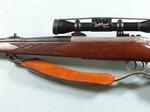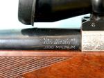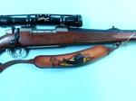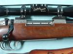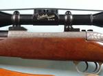 33145- WEATHERBY-J.P. SAUER EUROPA DELUXE GRADE OAK LEAF ENGRAVED MARK V .300 WEATHERBY MAG. CAL. RIFLE W/SCOPE CA. 1960’S. 26” barrel. All J.P. Sauer factory original for Weatherby including Sauer’s “Oak Leaf” engraving which was their specialty Deluxe grade engraving which they were known for. Checkered walnut with rosewood forend and pistol grip caps. Factory Weatherby pad. Oak Leaf engraved frame and trigger guard/floor plate assembly with “STAG” game scene on floor plate as well. Blued barrel and bolt. Original barrel sights and Weatherby 2X-7X scope and mounts. Excellent plus to near mint overall with 99% plus French Grey on receiver and trigger guard/floor plate assembly. Bolt and barrel with all the blue. Tight as new working order and mint bore. Stock with all the original finish. Scope in perfect working order and clear optics. Weatherby leather sling. $4750.