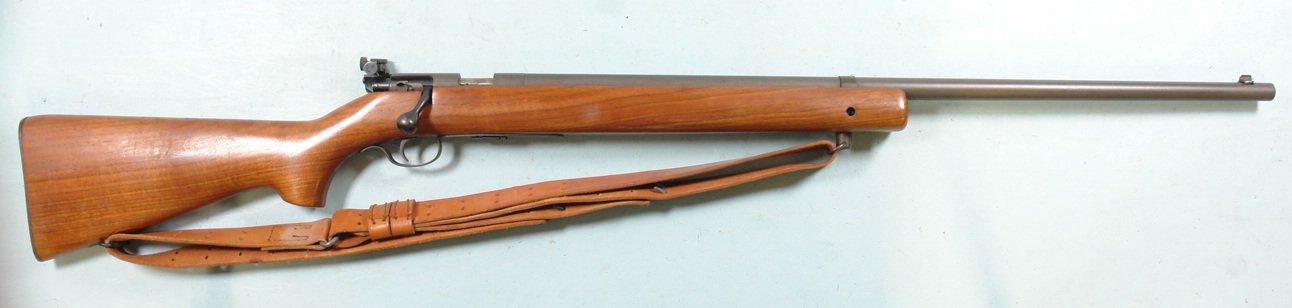 33144- WW2 WWII MILITARY FINISH WINCHESTER MODEL 75 TARGET .22 LR CAL. RIFLE MFG. 1940. 28” barrel with double set of tap holes for scope blocks. Factory parkerized finish overall with nearly all remaining. Although not “U. S. PROPERTY” stamped it is typical of arms contracted for in 1940-41 during the build-up for the war. Original stock with the original finish. Little use in near mint condition. Lyman receiver rear and bead front sights. Bore as new and in perfect working order. Commercial military style leather sling. Original magazine. $1050.