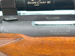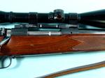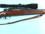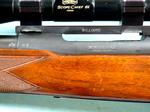 33001- PRE-64 WINCHESTER MODEL 70 SUPER GRADE .243 WIN. CAL. RIFLE MFG. 1956 WITH SCOPE. Original factory barrel professionally shortened to 22” with sights removed. Bolt handle polished and White Line recoil pad added. Otherwise all original excellent with 98-99% original blue and stock finish. Mint bore and perfect working order. Crosshair Bushnell Scope Chief 6X scope in Williams mount. Factory QD swivels and period leather sling. $1900.