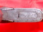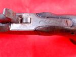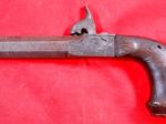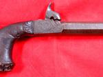 20428- FRENCH PERCUSSION .45 CAL. DAMASCUS BOX LOCK RETRACTING FOLDING TRIGGER POCKET PISTOL CIRCA 1840’S. 7” o/a with 2 ½” very finely figured Damascus smoothbore barrel. Floral. engraved box lock frame. Walnut grip with flattened floral carved butt and floral leaf carved frame panels. Very nice original finish with mixed dark handling patina on metal. Wood with the orig. finish. Perfect working order with trigger automatically retracting as it should. Nipple with wear otherwise excellent. Nice quality. $350.
