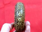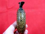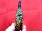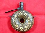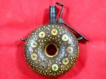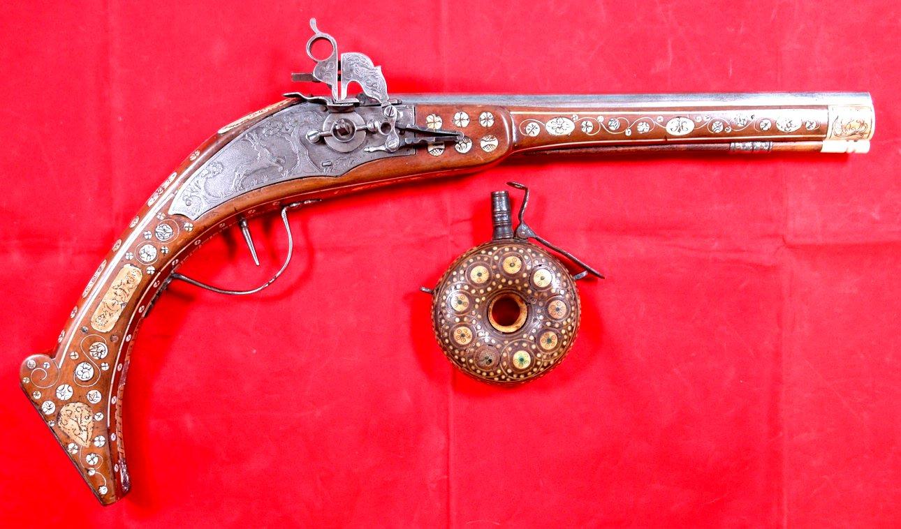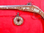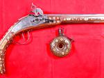 32717-ORIGINAL GERMAN WHEELOCK OR WHEELLOCK BONE INLAID DONUT PISTOL POWDER FLASK CIRCA 1575-1590’S. 3 ½” diameter with ornate full coverage bone and ivory inlay 1 ½” metal spout. Metal lanyard loops on either side. Has all the inlays except one which hole filled withhold resin like material turned dark that has been there for at least 200 years and looks ok. Extra nice example and very rate. Photograph along with wheelock pistol it came with not included(sold separately). $1650.
