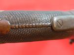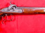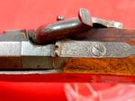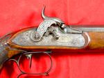 32724- LIEGE PERCUSSION DUELLING PISTOL BY J.B. HANQUET CIRCA 1820’S-30’S. Finest quality full stock percussion dueler with ornate engraving and gold maker cartouche on lock. 15” o/a with 9” octagon ornate pattern Damascus multi groove rifled .52 cal. sighted barrel. Checkered walnut stock with ebony and silver cap trap butt cap. Ornate floral engraving on steel mounts. Silver wedge escutcheons on forend. Set trigger and hammer safety Top quality Liege maker. Original rosewood ramrod with brass button tip. Excellent condition with grip having old hairline crack repair which is well done. Otherwise wood has all the original finish and metal the original dark untouched patina. Working order and very good bore. (SOLD) Call for sale price.