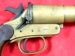 33098- BRITISH WW1 WWI WEBLEY & SCOTT VERY BRASS FLARE OR SIGNAL PISTOL. 10” o/a with 6” round smoothbore barrel with 1” bore. Stamped on right side of frame with serial number and Webley and Scott logo. Left side stamped “WEBLEY & SCOTT LTD./LONDON & BIRMINGHAM” above the Royal Ordnance proofs. Barrel with Ordnance acceptance stamps at left breech. Walnut grips. All original in working order with good bore. Nice condition overall. Superior example. $550.