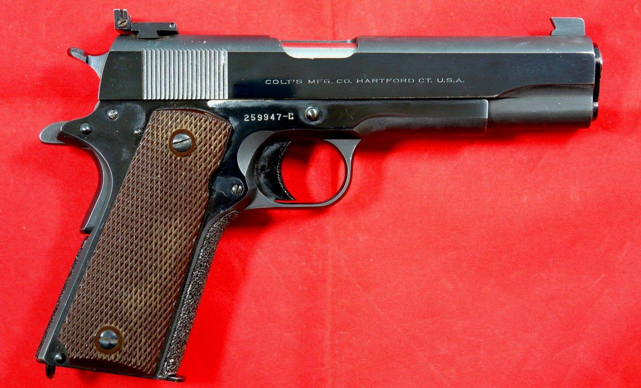 32951- COLT 1911 GOVERNMENT MODEL .45 ACP CAL. CUSTOM MATCH TARGET PISTOL MFG. 1953. Custom National Match 1911 with Micro Target sights and professionally stippled front and rear grip straps. Near new little used with all the original factory early 1950’s blue and mint original grips. Mint bore looks almost unfired. Extra nice quality post war 1911 Match. $1550.