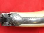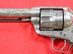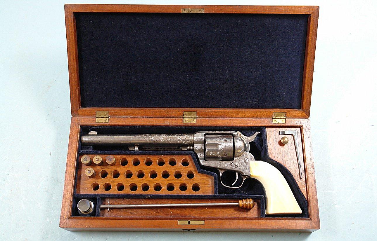 33081-EARLY CASED ENGRAVED COLT 1873 SINGLE ACTION ARMY .45 CALIBER REVOLVER MFG. 1877. 7 ½” barrel with early Colt Hartford one line block address. Frame with three patent dates and all matching serial numbers (40638). Nickel plated overall with the original ivory grips. Very similar style engraving illustrated in Wilson’s COLT ENGRAVING BOOK VOL.1, page 410 and 411 on Single Actions serial numbers 53078 and 92504 by factory engraver Cuno Helfricht. All original and in fine condition with much original nickel finish (50-60%). Perfect working order and excellent bore. Beautiful original ivory grips in excellent condition. Colt Archives records state it was shipped to Simmons Hardware in St. Louis in 1877. Letter does not mention engraving. With circa early 1900’s velvet lined walnut case. Extra nice and completely original in every respect. $12,500.
