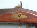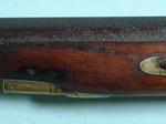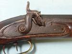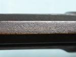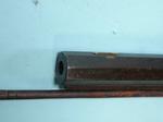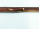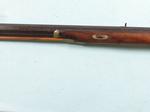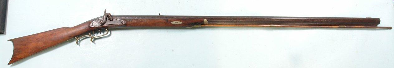 33074- NORTH CAROLINA NC PERCUSSION HALF-STOCK RIFLE SIGNED M.A. BAKER, FAYETTEVILLE, N.C. CIRCA 1857-63. 58” o/a with 42” octagon .47 caliber rifled barrel with the original brass blade front and semi-buckhorn rear sights and maker signed in script “M.A. BAKER, FAYETTEVILLE N.C.”. Rarely seen maker of rifles, shotguns and pistols before the Civil War and also a contractor to the Confederacy and the state of North Carolina converting flintlock military firearms to percussion during the war. All original and complete in good condition. Walnut stock with brass trigger guard, ramrod pipes, butt plate and side plate. Pewter forend cap and coin silver oval wedge escutcheons. Double set triggers. Original wood ramrod. Double triggers in working order. Original old metal patina with moderate pitting on barrel and lock. Wood with the original finish. Rare North Carolina rifle with excellent collection provenance. $2400.