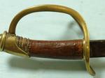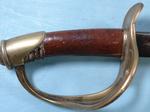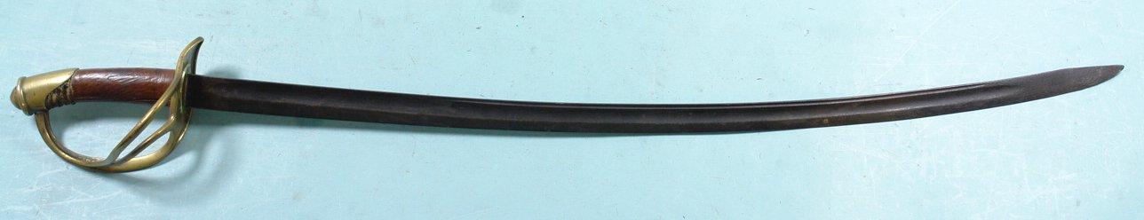 32525- CIVIL WAR U.S. MODEL 1860 CAVALRY SABER. 38” o/a with 32” blade. All original war used sword with wear. Original dark patina on blade. Good brass hilt with unbent guard. Grip wrap missing and with only a remnant of the retaining wire. Still nice looking and very reasonable. $275.