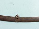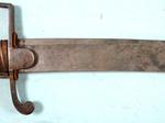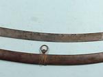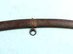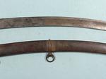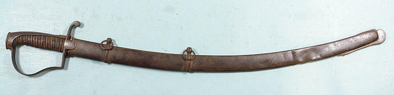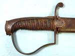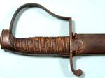 33111-BRITISH GEORGE III PATTERN 1788 MOUNTED ARTILLERY SABER AND SCABBARD. 33” o/a with 27” blade with Solingen “HUSSAR” trademark on both sides of blade associated with swords by J.J. Runkel a German sword maker who moved to London in 1780 making swords with blades he imported from Germany. Typical Pattern 1788 steel hilt with the original worn leather grip wrap and braided triple copper retaining wire. Very good overall with nice blade and marking. Scabbard with minor denting near drag. Rare form of short saber used by mounted artillery troops. Napoleonic Wars and War of 1812 era. $1100.