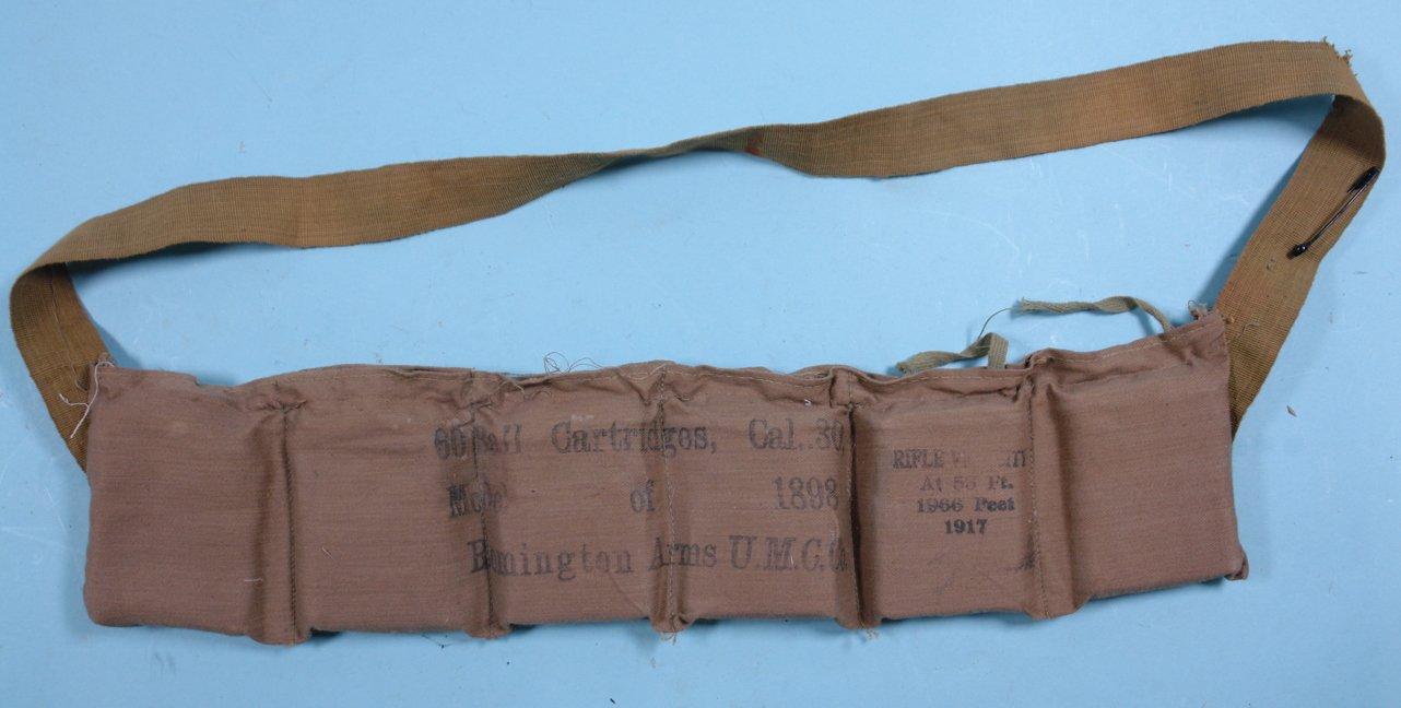 31982- ORIGINAL REMINGTON-U.M.C. .30-40 KRAG CAL. U.S. ISSUE BANDOLIER W/50 OF THE ORIG. 60 CTGS. Marked “REMINGTON ARMS U.M.C. CO./CARTRIDGES CAL. .30 1898”. Cartridges head stamped “RA/17” and “RA/18”. $295.