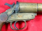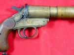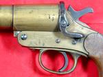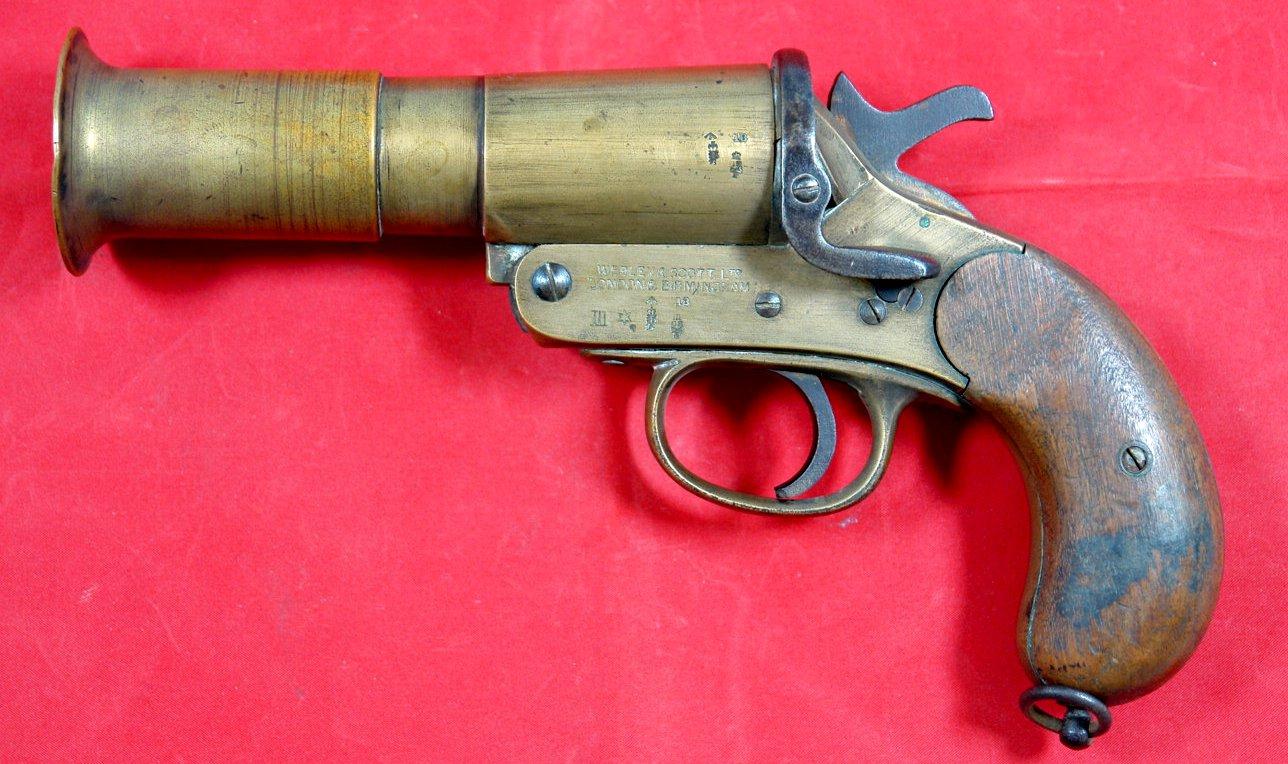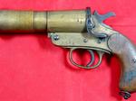 33098- BRITISH WW1 WWI WEBLEY & SCOTT VERY BRASS FLARE OR SIGNAL PISTOL. 10” o/a with 6” round smoothbore barrel with 1” bore. Stamped on right side of frame with serial number and Webley and Scott logo. Left side stamped “WEBLEY & SCOTT LTD./LONDON & BIRMINGHAM” above the Royal Ordnance proofs. Barrel with Ordnance acceptance stamps at left breech. Walnut grips. All original in working order with good bore. Nice condition overall. Superior example. $550.