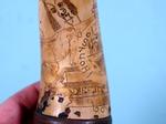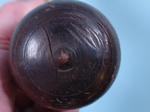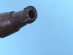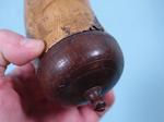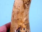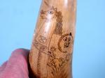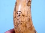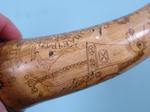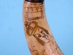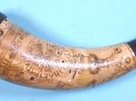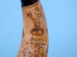 31873- FRENCH & INDIAN WAR AMERICAN “FOLKY ARTIST” CARVED POWDER HORN DATED 1759. 10 1/2” carved by “Folky Artist” probably while on campaign during the successful assault on Quebec in 1759 with the date encapsulated in a cartouche at the top of the horn. Large Royal Coat of Arms with “DIE ET MON DROIT” foot banner. Classic cartoon like “Lion” and “Unicorn” carving. Fine original patina on horn and large bulbous original wood plug of New York/New England style. Rare with only a dozen or so known. $5500.