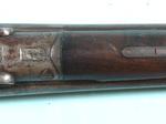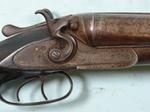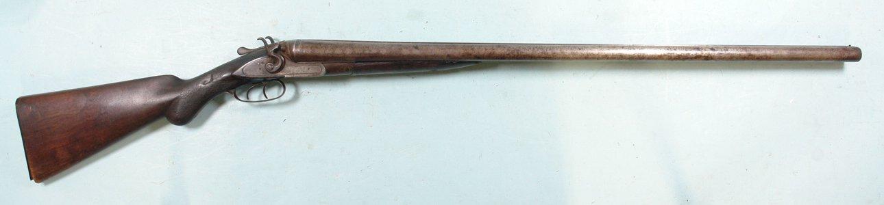 32750-BRITISH BONEHILL 10 GA. 32” SIDE X SIDE HAMMER DAMASCUS SHOTGUN. 2 ¾” Full & Full. London address on barrels. Locks engraved “THE BONEHILL/FIELD”. Good all original with wear and old dark patina. Locks in working order. Barrel release lever spring missing. Bores pitted. Wood with wear. Original butt plate. $200