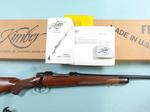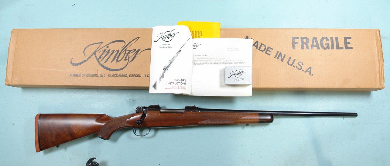 33039- KIMBER MODEL 89 BIG GAME .270 WIN. CAL. RIFLE W/RINGS IN ORIG. BOX & OWNER’S MANUAL. 22” barrel. Walnut stock with rosewood forend cap. All original and excellent plus with 99% plus original blue and all the stock finish. Mint bore and working order. Box numbered to gun. $2900.