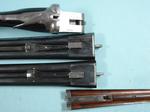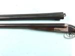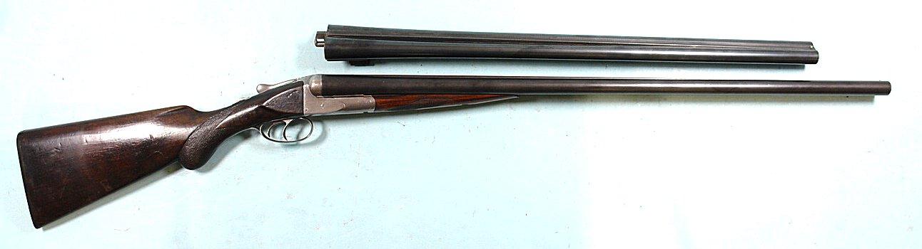 33048- ANSLEY H. FOX, PHILADELPHIA A GRADE 12 GAUGE SIDE X SIDE 30” SHOTGUN W/EXTRA MATCHING SET OF 26” BARRELS NUMBERED TO GUN. MFG. 1908. Both sets of barrels (Krupp) with 2 ¾” chambers. 30” set choked Modified and Modified. 26” set choked Improved Cylinder and Modified. Double triggers, auto safety and extractors. Frame engraved on both sides “ANSLEY H. FOX”. Serial in the 8xxx range and matching. Original wood with semi-pistol grip checkered butt stock with hard rubber original butt plate. 1 ½”, 2 ¾” drop. 14” pull. Very good overall with moderate wear. Frame medium grey patina. Barrels with approximately 90% blue. Excellent bores. Tight working order. Priced reasonably and it still has a lot of shooting left in it. $1450.