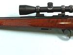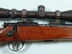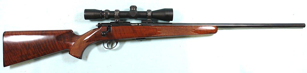 33049- ANCHUTZ MODEL 1710 BOLT ACTION .22LR RIFLE W/SCOPE. 24” barrel. 5 round mag. Deluxe fancy walnut checkered pistol grip stock. Near new with all the original finish. A few pinhead size storage nicks in varnish. Looks unfired. Perfect working order and mint bore. Burris Rimfire 3x9 crosshair scope with caps in perfect condition. $2300.