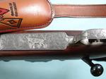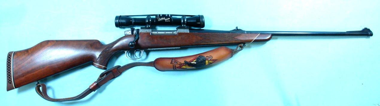 33145- WEATHERBY-J.P. SAUER EUROPA DELUXE GRADE OAK LEAF ENGRAVED MARK V .300 WEATHERBY MAG. CAL. RIFLE W/SCOPE CA. 1960’S. 26” barrel. All J.P. Sauer factory original for Weatherby including Sauer’s “Oak Leaf” engraving which was their specialty Deluxe grade engraving which they were known for. Checkered walnut with rosewood forend and pistol grip caps. Factory Weatherby pad. Oak Leaf engraved frame and trigger guard/floor plate assembly with “STAG” game scene on floor plate as well. Blued barrel and bolt. Original barrel sights and Weatherby 2X-7X scope and mounts. Excellent plus to near mint overall with 99% plus French Grey on receiver and trigger guard/floor plate assembly. Bolt and barrel with all the blue. Tight as new working order and mint bore. Stock with all the original finish. Scope in perfect working order and clear optics. Weatherby leather sling. $4750.