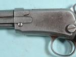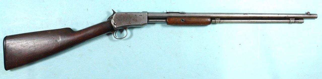 32897- WINCHESTER MODEL 06 PUMP 22 S,L,LR CAL. RIFLE CA. 1909. 20” barrel with original bead front and 1901 patent screw elevator rear missing the elevation screw. All original except the hard rubber butt plate an old replacement and the barrel which is a factory replacement with circled “P” proof to the rear of the Smokeless Proof stamp at top breech of barrel. Very good with minor amounts of blue in recesses of barrel and tube with balance a grey worn patina. Wood with wear and old handling patina. Tight working order and excellent bore. SOLD- Call for sale price.